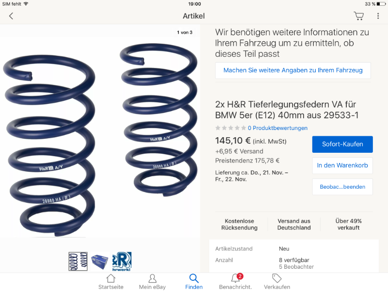 Hallo, da ich immer noch am überlegen bin wie ich mein E9 tieferlege würde ich gerne wissen ob die Federn vom E12 erster Serie in den E9 passen würden.