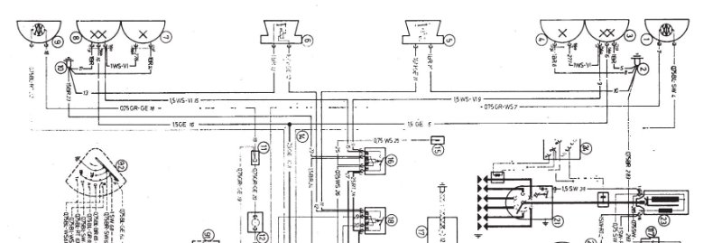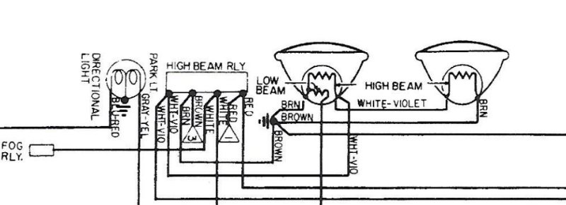 hier ein Ausschnitt aus dem Schaltplan in englisch, ich denke er ist für die US-Version. Hier hat die äußere Lampe einen low-beam (Abblendlicht) und einen high-beam (Fernlicht) Glühfaden, die innere Lampe nur einen high-beam (Fernlicht). D.h. in der US-Version brennen bei Fernlicht insgesamt vier Lampen!