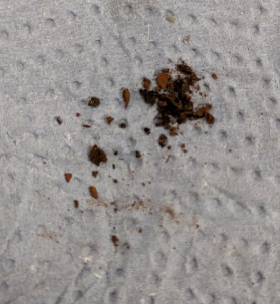 Als ich beim vorderen Vergaser die Hauptdüse der 2. Stufe herausschraubte und anschliessend den Platinenblock drehte, um die Luftkorrekturdüse herauszuschrauben lag plötzlich ein "gepresster Rosttaler" auf meiner Unterlage.