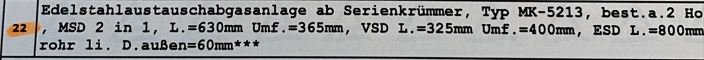 Ich musste für eine Edelstahlauspuffanlage eines anderen Anbieters (welcher auch der Hersteller war) eine Einzelabnahme inkl. Geräusch-Messungen durchführen lassen. (282€, Gutachten zur Erlangung der Betriebserlaubnis...")