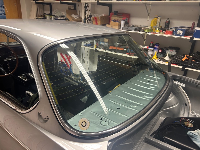 Scheiben sind nun auch drin. Hinten ging es problemlos und vorne haben wir 5 Anläufe gebraucht . Hier war es wichtig das die Scheibe perfekt zentriert wurde . Des weiteren hat es geholfen den Gummi gut mit Vaseline einzuschmieren. Vielen Dank an Ulli und Gerhard für die hilfreichen Tipps auf der Retro Classics .