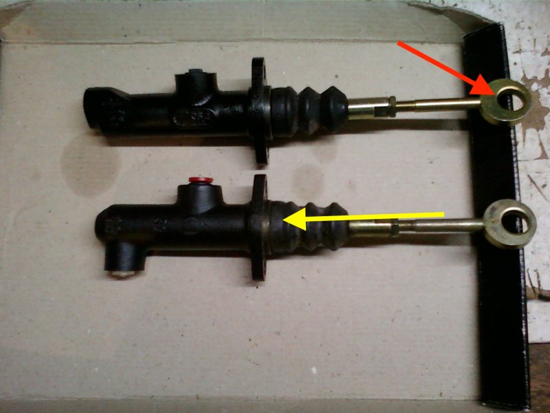 Prinzipiell gibt es 2 unterschiedliche Kupplungsgeberzylinder. Bis 73 war der Abgang nach unten, ab 74 war der Abgang nach vorne. Für dich wichtig ist die gelbe Markierung. Genau so wie dieser Pfeil zeigt, musst du, an der Gummimanschette vorbei, mit einer Fettspritze, Kriechöl oder ähnlichem, das Ende der Druckstange erreichen. Das ist da, wo der gelbe Pfeil endet.