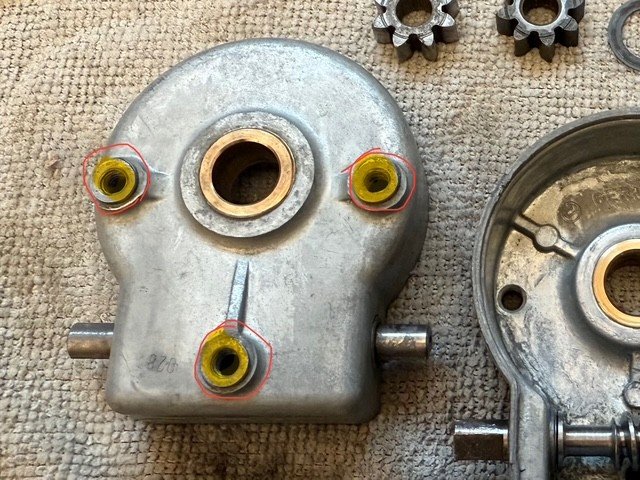c) das dritte Loch auf meiner Grundplatte einen kleineren Durchmesser hat als die anderen zwei, sodass das Getriebe nicht plan aufliegen kann (siehe Bild) die gelb markierten Bereiche "verschwinden" in der Grundplatte und fixieren das Getriebe radial, weil die Löcher in der Grundplatte genau den Durchmesser der etwas herausstehenden Hülse haben (ich glaube 8mm). Das stimmt bei mir aber nur für die beiden Löcher oben im Bild. Das untere lag zu weit oben auf der Grundplatte, weil das Loch in der Grundplatte kleiner war und deswegen auch leicht gekippt.
