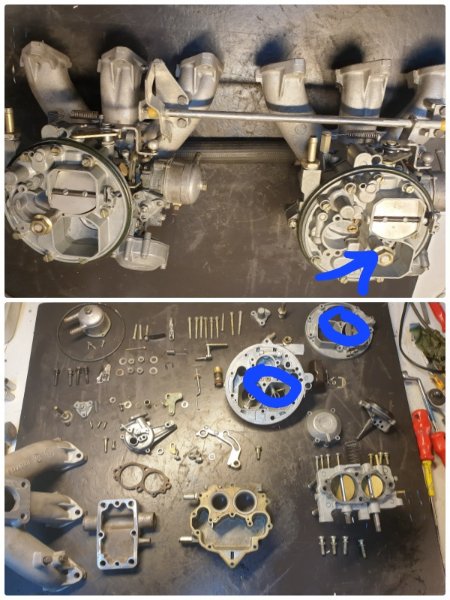 ich denke wir reden da nicht vom Gleichen, denn meiner Meinung nach meint der Jakob die Befestigung der Platte mit der Düsenbestückung am Schwimmerkammergehäuse (3x rot). Die Schraube in der Mitte hält den Oberteil auf dieser (9x blau) und ja, die in der Mitte hab ich auch gesucht damals... ;-)