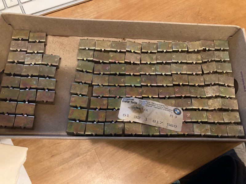 Ich habe noch 100 Klammern, Teilenummer 51 32 1 817 560 gefunden. Diese sind nicht mehr lieferbar und passen für die U-Bürste der hinteren Seitenscheibe. Preis je Stück 3,50 Euro.