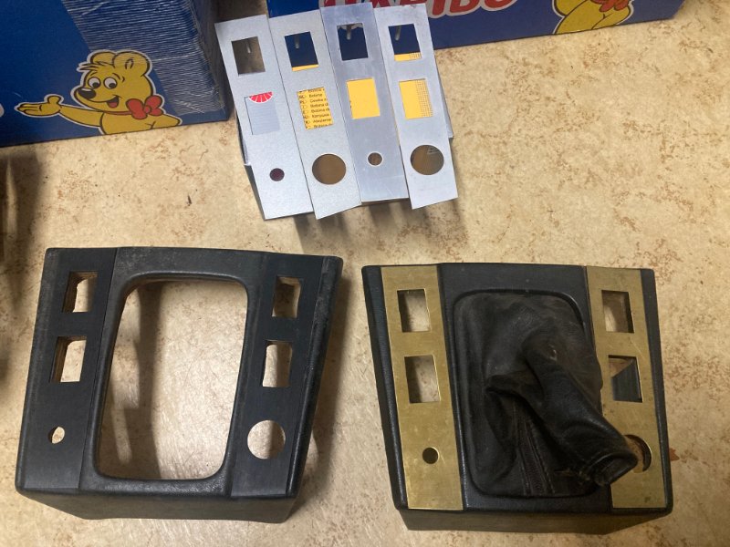 Das dritte Bild zeigt nachgefertigte Blenden in der Schaltkonsole. Ein paar sind noch in Messing (zum verchromen) vorhanden. So ein Paar kostet 40 Euro. Ein Satz ist in schwarz eloxiert. Diese beiden kosten 60 Euro.