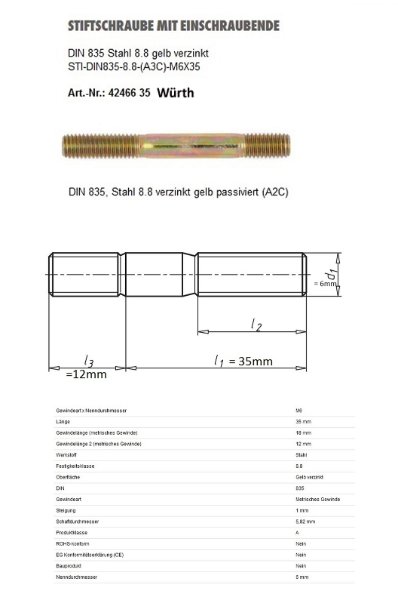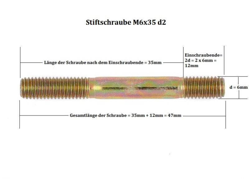 Durchmesser: 6mm, Länge der Schraube ohne Einschraubende: 35mm, Länge des Einschraubendes: 2 x Durchmesser 6mm = 12mm (dieser zweifache Durchmesser d2 bei Stehbolzen entspricht DIN 835.)