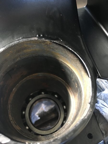 Nachdem ich die alten Simmerringe und Radlager von der gegenüberliegenden Seite rausgeschlagen habe, musste ich vor dem Entlacken und Entrosten im Tauchbad noch die beiden Lagergummis entfernen. DIe alten klebten dermaßen in der Buchse fest, so dass ich mit einem 5er Bohrer erst mal ein paar Entlastungsbohrungen in Längsrichtung durch den Gummi gebohrt habe. Danach waren sie mit einer Gewindestange, Mutter und ein paar passenden Nüssen und Hülsen easy zu entfernen. Nach dem Pulverbeschichten konnte ich die neuen Gummis, mit ein paar dickeren Unterlagen auf der Presse, ohne Beschädigung der Beschichtung wieder einpressen. (Mit Hülsen kommt es immer zu Beschädigungen....)