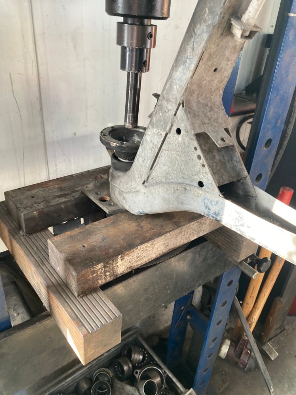 Ich bin gerade mal wieder dabei ein paar Dreieckslenker zu überholen. Bei den bisherigen die ich überholt habe, waren die Bremsbleche immer stark verrostet und ich konnte die Achsstummel immer direkt über das Bremsblech auspressen. Die verbogenen und verrosteten Bremsbleche hab ich danach immer entsorgt. Nun hab ich aber einen Querlenker bei dem das Bremsblech wie neu ausgesehen hat, und ich wollte es nicht beschädigen. Also hab ich es abgeschraubt, den Querlenker auf die Presse gelegt und überlegt wie man das beschädigungsfrei ausbauen könnte. Zufällig lagen vier 4 Kantteile (Vollmaterial) in der Werkstatt. Stabile 4 Kantrohre hätte ich wohl auch verwenden können:-) Nach diesem Kraftakt hab ich die unteren zwei Lager längs hingelegt, so dass das Bremsblech zwischen rein passte. Die nächste zwei Lager hab ich quer darüber gelegt und den Querlenker an der Bremszangenaufnahme auf diese Lager gelegt. Nun konnte ich den Achsstummel einwandfrei auspressen.