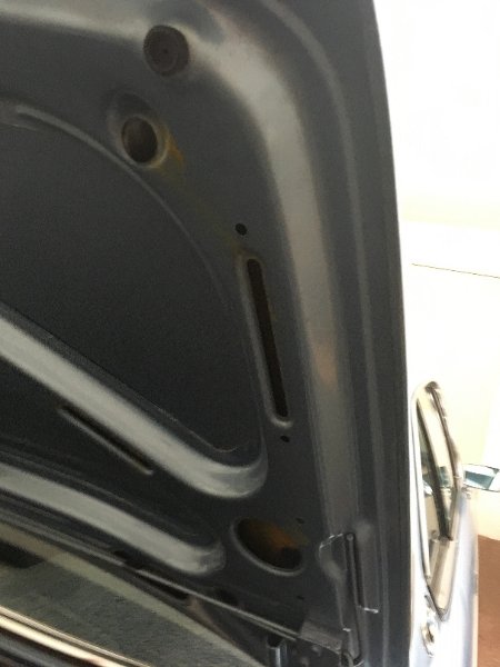 Wer weiss warum an beiden Innenseiten die Langschlitze mit Bohrloch oben/unten am Kofferraumdeckel vorgefertigt wurden? Ggf. schon eine Halterung für Gasfedern ? Das wäre zu prüfen,wenn vom Werk vorgesehen,ist es auch bauzeitgemäß und H-fähig.