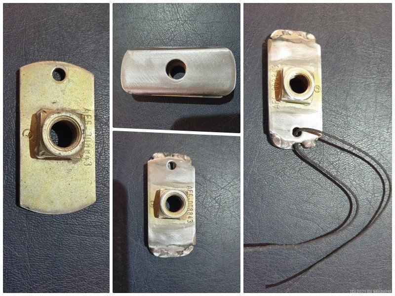 um am kompletten Fahrzeug nicht schweißen zu müssen, verwende ich zum fixiern der Mutter immer eine Stahlniet. Vorher "fange" ich die Mutter immer mit einer längeren 7/16 UNF mit der ich die Mutter an den Radhausbogen ranziehe.