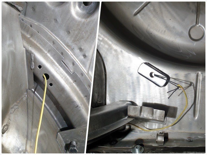Der Zugdraht wird durch das mittlere Loch nach hinten in den Radlauf geschoben, bis es im Kofferraum wieder sichtbar wird. Dort wird nun die Halterplatte angehängt. Dabei wird der Faden doppelt durch die Mutter nach vorne gefädelt und leicht verknotet.
