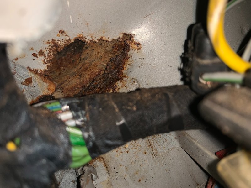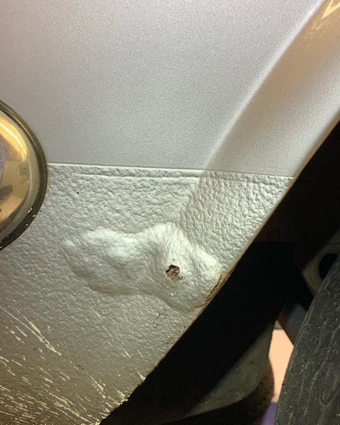 Der Aufprall hinten hat eine kleine Falte im Kofferraum hinterlassen wo jetzt ein 1cm² großes Loch ist und dann noch 2x5cm² in den Radläufen, 3cm² beim Sicherungskasten und 1cm² im Handschuhfach. Am Boden ist eigentlich nichts ausser die kleinen Aufnahmebleche vorne am Radlauf und noch eine Kleinigkeit wo die Dichtung der Motorhaube aufliegt. Also insgesamt für e9-Verhältnisse wenig Blecharbeiten.
