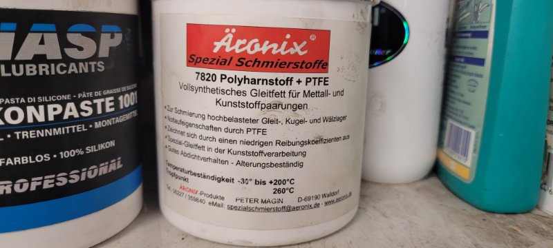 da die Gleitstücke aus Kunststoff sind, nehme ich das weiße Fett für Kunststoffgelenke. Normales Fett können Säuren enthalten, die die Kunststoff Gleitstücke zerstören.